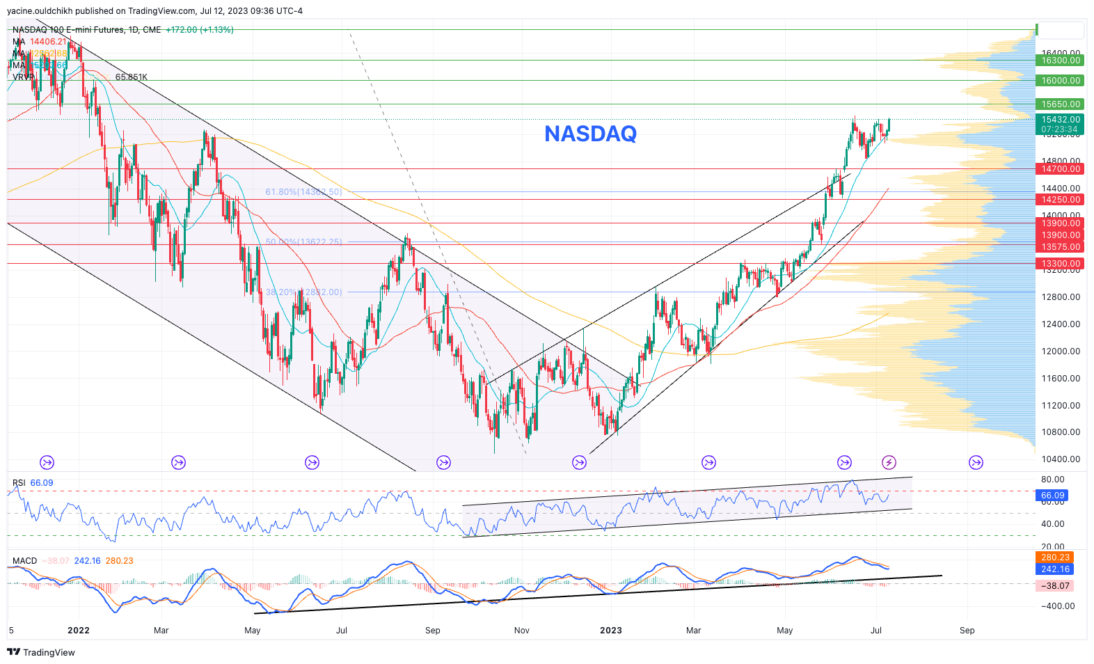 The S&P500 reached yearly highs after breaking above the recent high of 4497 and is now trading around 4515. The softening inflation figure has clearly opened the door for risk assets to squeeze higher. Once again, as long as the index is trading above its 20-day moving average, it would be wise to remain bullish.