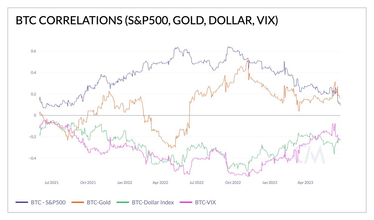 Bitcoin’s correlation to other asset classes has significantly changed since the start of the year. The 90-day correlation to the S&P%500 declined from 0.40 to 0.10, its lowest level since June 2021, while the negative correlation to the US Dollar Index improved from 0.40 to 0.20 in the same time period.