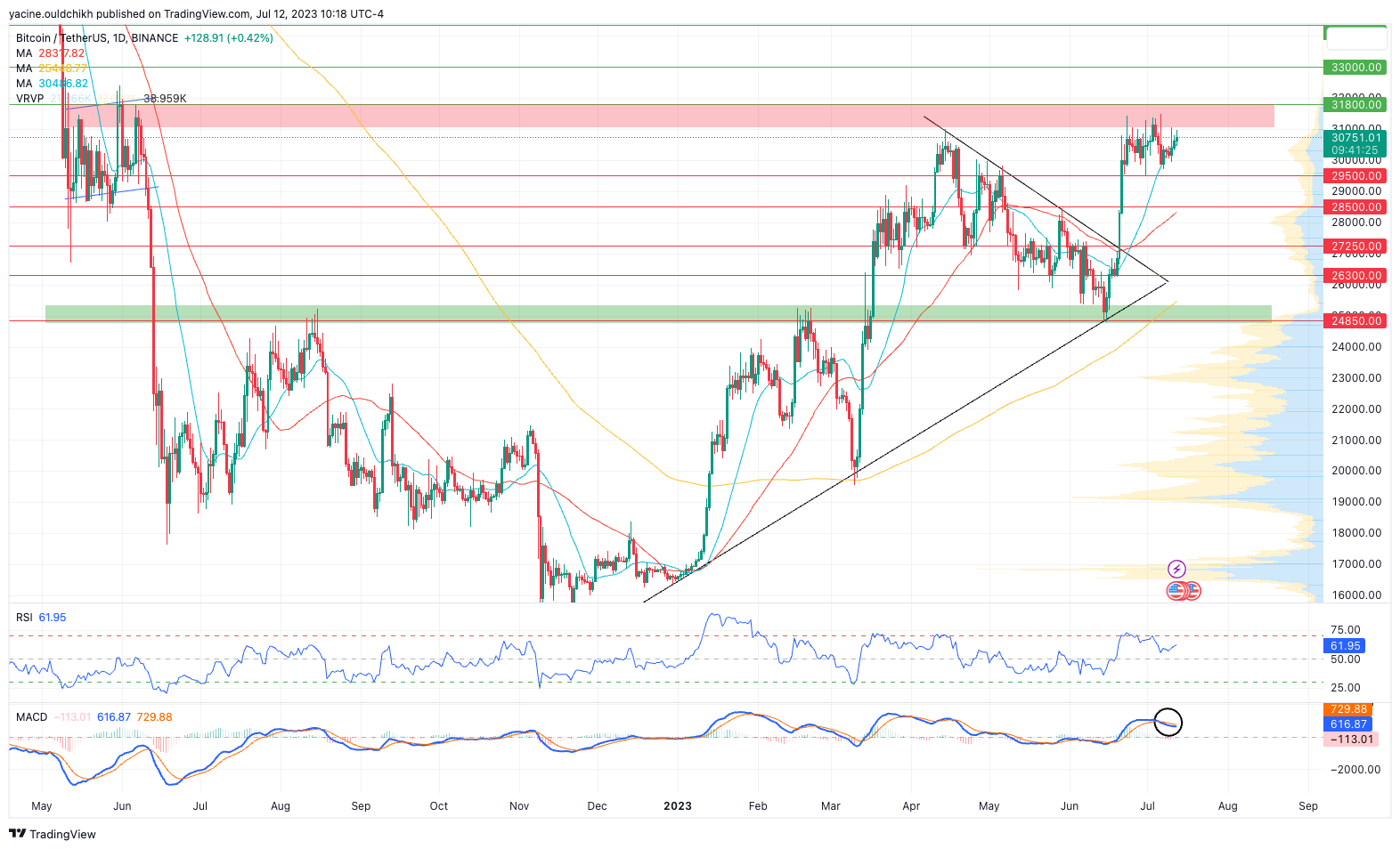 Looking at price action, BTCUSDT is struggling to break and close above 30,850. Once we break that barrier, prices will face their next challenge at 31,500.