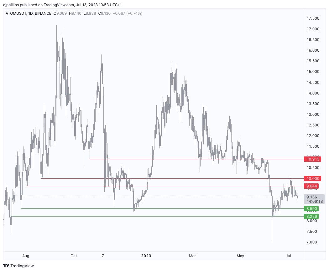 ATOM/USDT - On the daily chart, price is in an established downtrend. Since our last visit, the resistance levels that we were watching have provided strong reactions. Price is now likely to seek lower levels to mitigate the wick created 10th June, which would mean revisiting lows from June of the previous year.