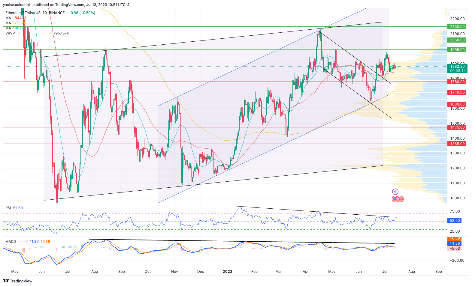 Looking at price action, once again, nothing significant to report here. Prices continue to range between 1825 and 1935. A breakdown of 1825 would confirm the breakdown of a Head-and-Shoulders pattern while a breakout of 1935 would trigger bullish implications sending the coin higher towards 1995.