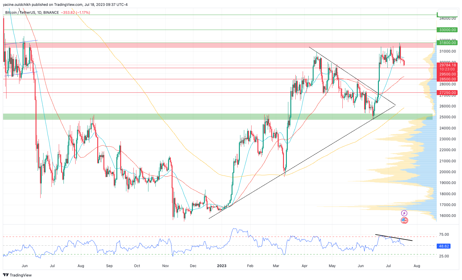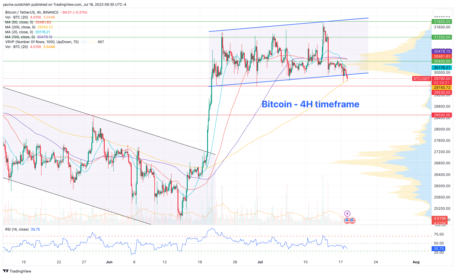 BTCUSDT has been trying to rebound off the lows of the consolidation channel on an intraday basis but can’t seem to surpass the resistance set at 30,400 which is needed to confirm a recovery. Right now, it seems that prices want to break below this pattern to the downside.