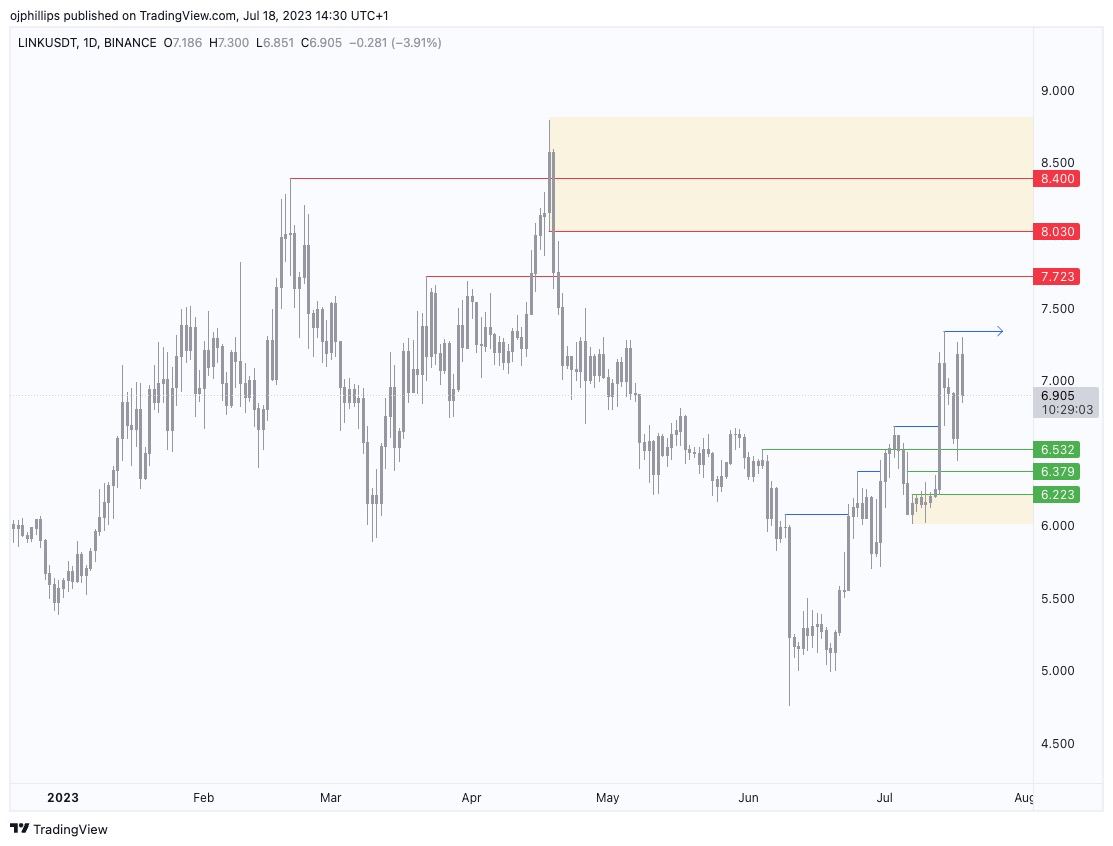 LINK/USDT - On the daily chart, price has formed bullish structure, as we anticipate the high of 7.344 to be broken to continue the uptrend.