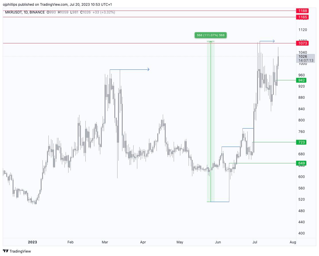 MKR/USDT - On the daily chart, it can be seen since the 10th June '23 MKR has boasted a 110% return on its USDT pair. Since bearish structure was broken, the bulls have maintained strong momentum to the upside, suggesting there is a good chance the previous high at 1080 will be taken out to continue the uptrend.
