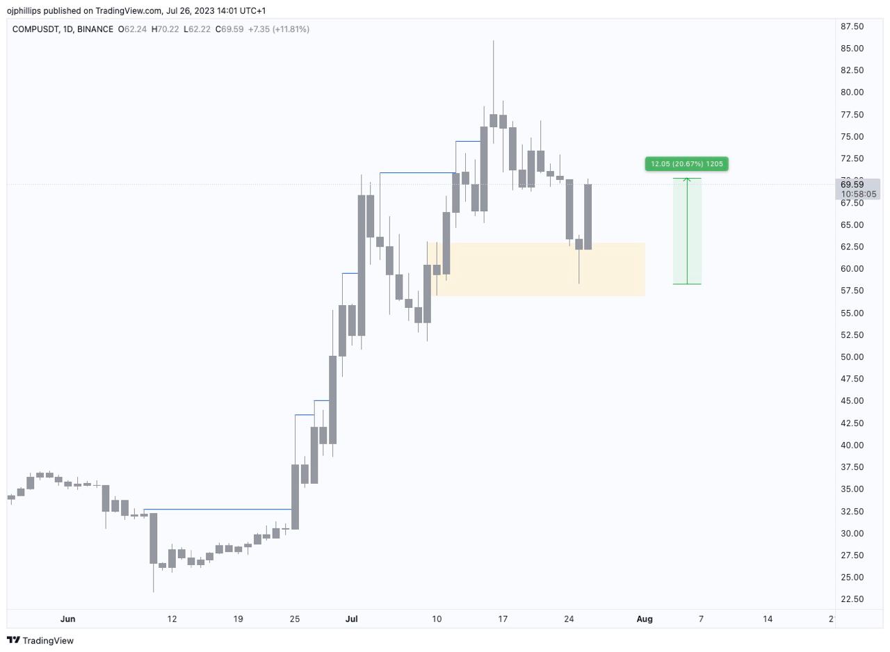 COMP/USDT - Price has been in a strong uptrend since June 10th. The pullbacks have had slow momentum, meanwhile the upward moves are sharp, reinforced by high volume. The highlighted demand region is where buyers have stepped in. It is likely that large orders were filled at the 60.00 price level.